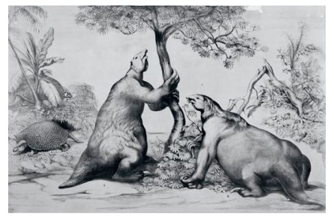 Rekonstruksi dua kukang darat raksasa (Megatherium) dan di belakangnya dua armadillo raksasa (Glyptodon). Kini telah punah, armadillo raksasa memiliki panjang lebih dari tiga meter dan berat hingga dua ton, sedangkan kukang darat raksasa mencapai tinggi hingga enam meter dan berat sampai delapan ton.