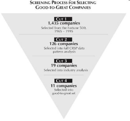 Setelah dua puluh delapan perusahaan dipilih (sebelas good-to-great, sebelas perbandingan langsung, enam perbandingan tidak berkelanjutan), tim penelitian melakukan langkah-langkah dan analisis berikut.