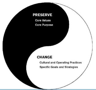 Pertahankan ideologi inti sebagai titik jangkar sambil mendorong perubahan, perbaikan, inovasi, dan pembaruan di semua hal lainnya. Ubah praktik dan strategi sambil menjaga nilai inti dan tujuan tetap, serta tetapkan dan capai BHAG yang konsisten dengan ideologi inti.