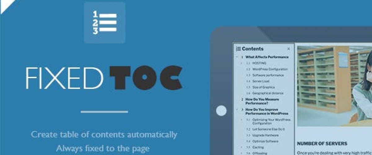Fixed TOC is a powerful Wordpress plugin. It scans headings through the post content automatically and creates the table of contents, Fixed in the page display. Users can faster find the content they want.