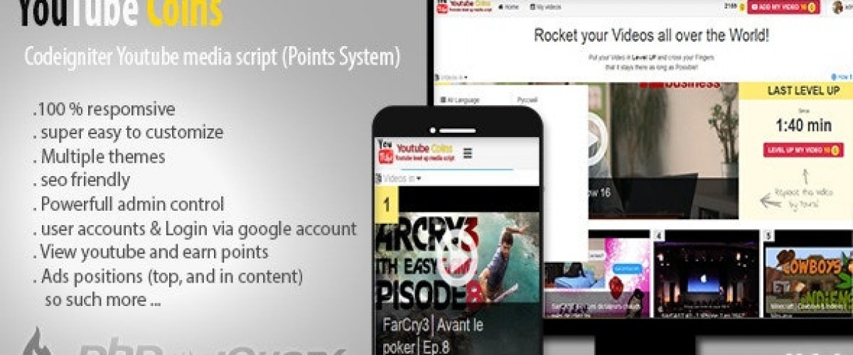 This script allows users to upload youtube videos and earn coins via viewing videos (Edit setting to change the amount of coins on register,login,viewing and add new video). to highlight your video you have to buy the first location (For Example 10 coins) and you can change this amount 10 coins from admin/setting