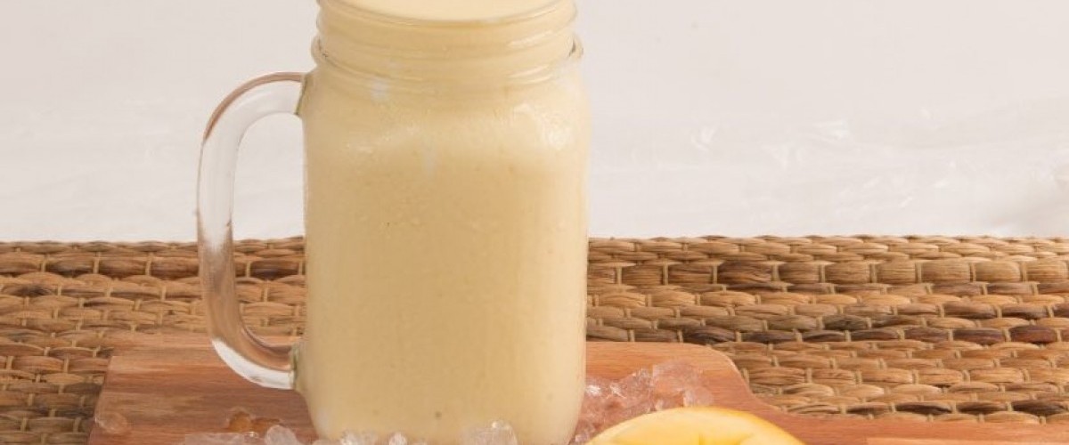 b. Blender mangga dengan campuran yogurt kental, yogurt cair, dan air perasan jeruk nipis.