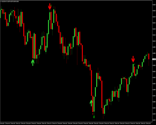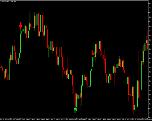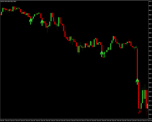 Panah hijau muncul di bawah candlestick merah.