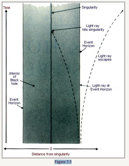 Pada masa itu belum ada definisi yang tepat mengenai titik-titik mana dalam ruang-waktu yang berada di dalam lubang hitam dan mana yang berada di luarnya. Saya telah mendiskusikan dengan Roger Penrose gagasan untuk mendefinisikan lubang hitam sebagai himpunan peristiwa yang darinya tidak mungkin meloloskan diri ke jarak yang sangat jauh, yang kini menjadi definisi yang diterima secara umum. Ini berarti bahwa batas lubang hitam, yakni cakrawala peristiwa, dibentuk oleh berkas-berkas cahaya yang nyaris gagal meloloskan diri dari lubang hitam, melayang selamanya tepat di tepinya Gambar 7:1. Hal ini agak menyerupai seseorang yang melarikan diri dari polisi dan hanya mampu mempertahankan jarak satu langkah di depan, tetapi tidak pernah benar-benar berhasil menjauh!