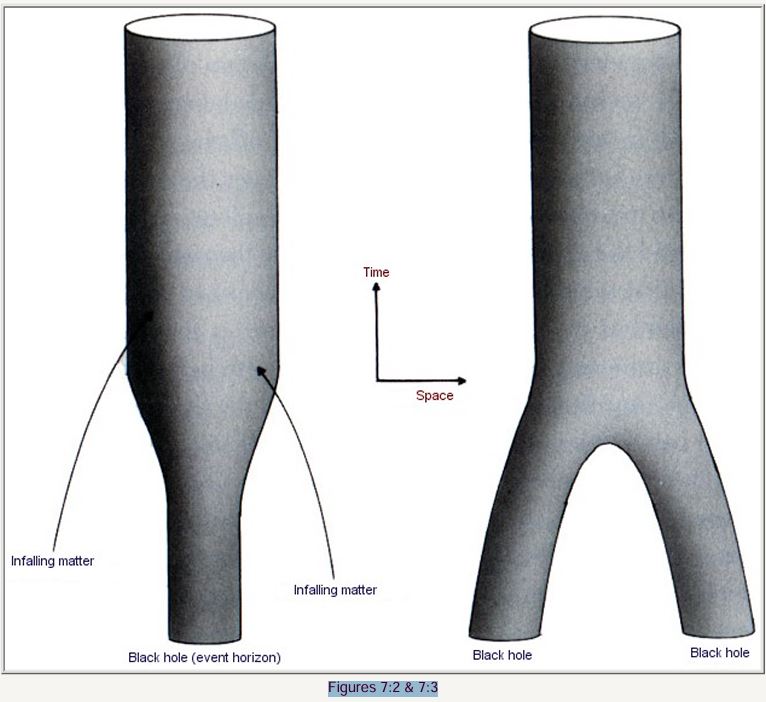Atau jika dua lubang hitam bertabrakan dan bergabung membentuk satu lubang hitam tunggal, maka luas cakrawala peristiwa lubang hitam akhir akan lebih besar atau sama dengan jumlah luas cakrawala peristiwa dari lubang hitam-lubang hitam semula Gambar 7:3. Sifat yang tidak pernah berkurang dari luas cakrawala peristiwa ini memberikan batasan penting terhadap kemungkinan perilaku lubang hitam. Saya begitu bersemangat dengan penemuan ini hingga malam itu saya hampir tidak tidur.