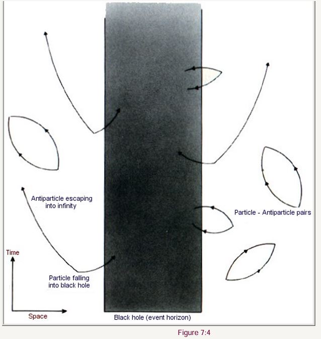 Karena itu, jika terdapat lubang hitam, partikel virtual berenergi negatif dapat jatuh ke dalam lubang hitam dan menjadi partikel atau antipartikel nyata. Dalam keadaan ini ia tidak lagi harus memusnahkan diri dengan pasangannya. Pasangan yang ditinggalkannya mungkin juga jatuh ke dalam lubang hitam. Atau, karena memiliki energi positif, ia dapat lolos dari sekitar lubang hitam sebagai partikel atau antipartikel nyata Gambar 7:4.