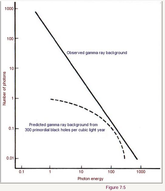 Kita memang mengamati latar belakang sinar gamma semacam itu: Gambar 7:5 menunjukkan bagaimana intensitas teramati berbeda pada frekuensi yang berlainan (jumlah gelombang per detik). Namun latar belakang ini bisa saja—dan kemungkinan besar memang—dihasilkan oleh proses selain lubang hitam primordial. Garis putus-putus dalam Gambar 7:5 menunjukkan bagaimana intensitas seharusnya berubah terhadap frekuensi untuk sinar gamma yang dipancarkan oleh lubang hitam primordial, jika rata-rata terdapat 300 per tahun cahaya kubik.