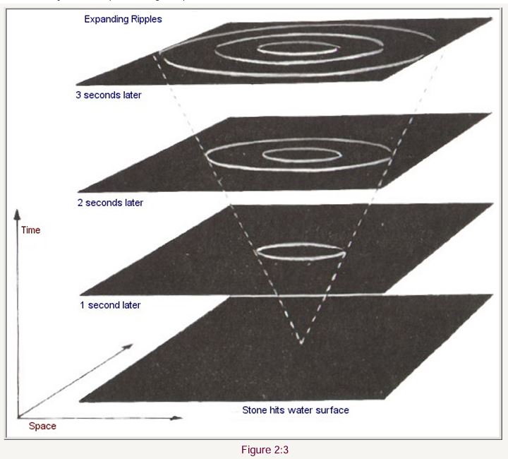 Sebagaimana telah kita lihat, persamaan Maxwell meramalkan bahwa kecepatan cahaya harus sama, apa pun kecepatan sumbernya, dan hal ini telah dikukuhkan oleh pengukuran yang akurat. Dari sini mengikuti bahwa jika suatu pulsa cahaya dipancarkan pada waktu tertentu di suatu titik tertentu dalam ruang, maka seiring berjalannya waktu ia akan menyebar sebagai sebuah bola cahaya yang ukuran dan posisinya tidak bergantung pada kecepatan sumbernya. Setelah sepersejuta detik, cahaya akan telah menyebar membentuk sebuah bola dengan jari-jari 300 meter; setelah dua sepersejuta detik, jari-jarinya menjadi 600 meter; dan seterusnya. Hal ini serupa dengan riak yang menyebar di permukaan kolam ketika sebuah batu dilemparkan ke dalamnya. Riak itu menyebar sebagai lingkaran yang semakin membesar seiring waktu. Jika seseorang menumpuk potret-potret riak pada waktu yang berbeda satu di atas yang lain, lingkaran riak yang mengembang itu akan membentuk sebuah kerucut yang puncaknya berada pada tempat dan waktu ketika batu tersebut menyentuh air (Gambar 2:3).