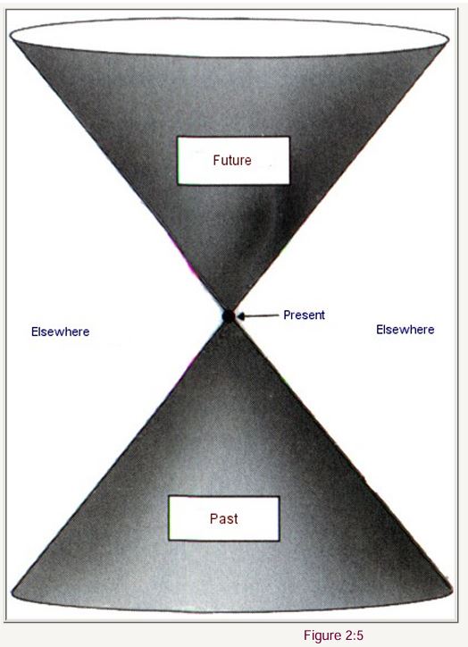 Demikian pula, cahaya yang menyebar dari suatu peristiwa membentuk sebuah kerucut (tiga dimensi) dalam ruang-waktu (empat dimensi). Kerucut ini disebut kerucut cahaya masa depan dari peristiwa tersebut. Dengan cara yang sama kita dapat menggambar kerucut lain, yang disebut kerucut cahaya masa lalu, yaitu himpunan peristiwa-peristiwa dari mana suatu pulsa cahaya dapat mencapai peristiwa yang dimaksud (Gambar 2:4).