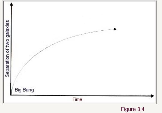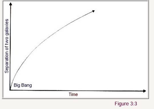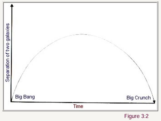 Gambar 3:2 memperlihatkan bagaimana jarak antara dua galaksi yang bertetangga berubah seiring bertambahnya waktu. Jarak itu bermula dari nol, meningkat hingga mencapai suatu nilai maksimum, lalu menyusut kembali hingga nol.