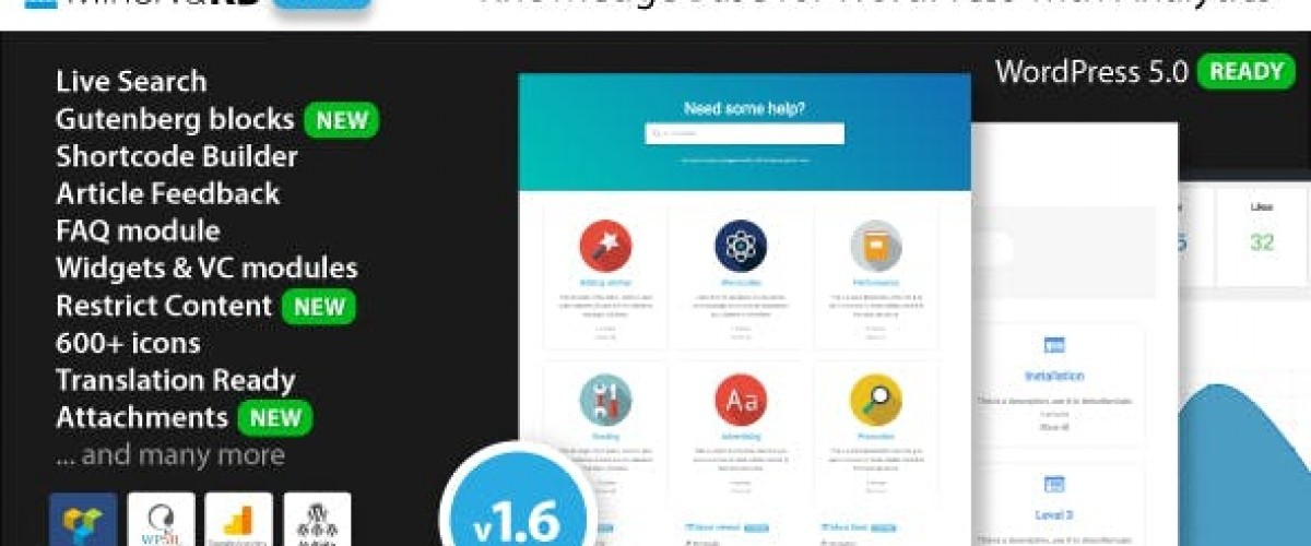 Ajax intuitive Live Search with multiple themes Analytics dashboard, with views, likes and dislikes weekly / monthly graph Search analytics – see what users searched for and which results they received Shortcode builder One-click demo import Articles feedback Content restriction. Restrict access to articles based on user role. Show login form and teaser to users who are not registered.
